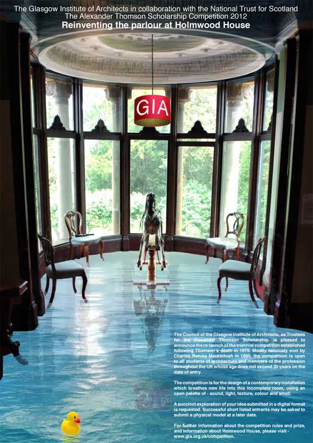 Judges, including representatives from GIA, NTS, the Mackintosh School of Architecture, and the Alexander Thomson Society, selected the winning entry from a shortlist of nine entries drawn from eighteen submissions. Together, GIA and NTS hope to raise sponsorship to create the installation on site, and will be mounting an exhibition of all the entries when Holmwood House re-opens to the public in Spring 2013.