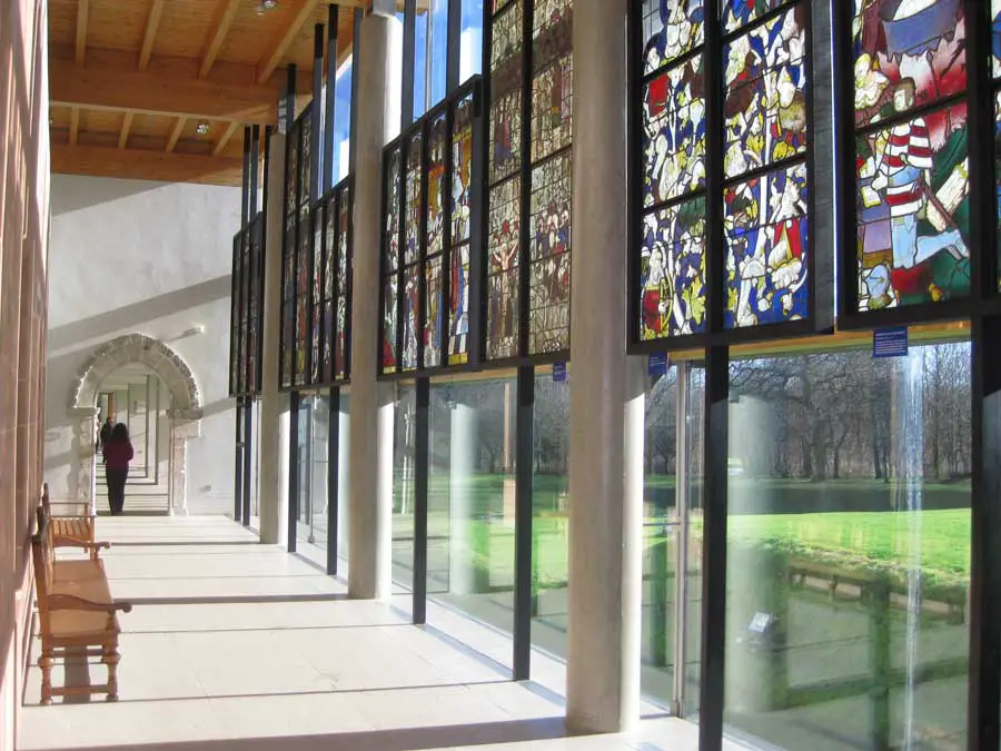The entrance to the collection itself is the Hornby portico, a 26-feet high English Renaissance doorway which weighs 26 tons. The Burrell Museum incorporates reproductions of three rooms from Hutton Castle, near Berwick-on-Tweed, where Sir William and Lady Burrell moved in 1927. These are the drawing room, hall, and dining room, each furnished in the original manner and with some original woodwork. The building has storage for the many items from the collection not on display, a restaurant, lecture theatre, children’s activities space, library, photographic studio, and living quarters for visiting scholars.