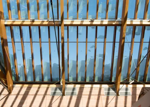 The building forms a huge L-shape, with entry from the south (into one end of the ‘L’ on axis) through a 13-foot high 16th-century archway into the glazed courtyard of the gallery. The Burrell Collection is formed of huge unadorned facades of ashlared Locharbriggs red sandstone, peeled away in zones for glazing. The windows are not expressed: instead the glass folds with the eaves and forms a smooth envelope supported on rational steel and timber portal structures at close centres – there is nothing light about this project. This makes the building seem sombre amongst the trees, and even where the lawns open out, the landscape is controlled into terraces.